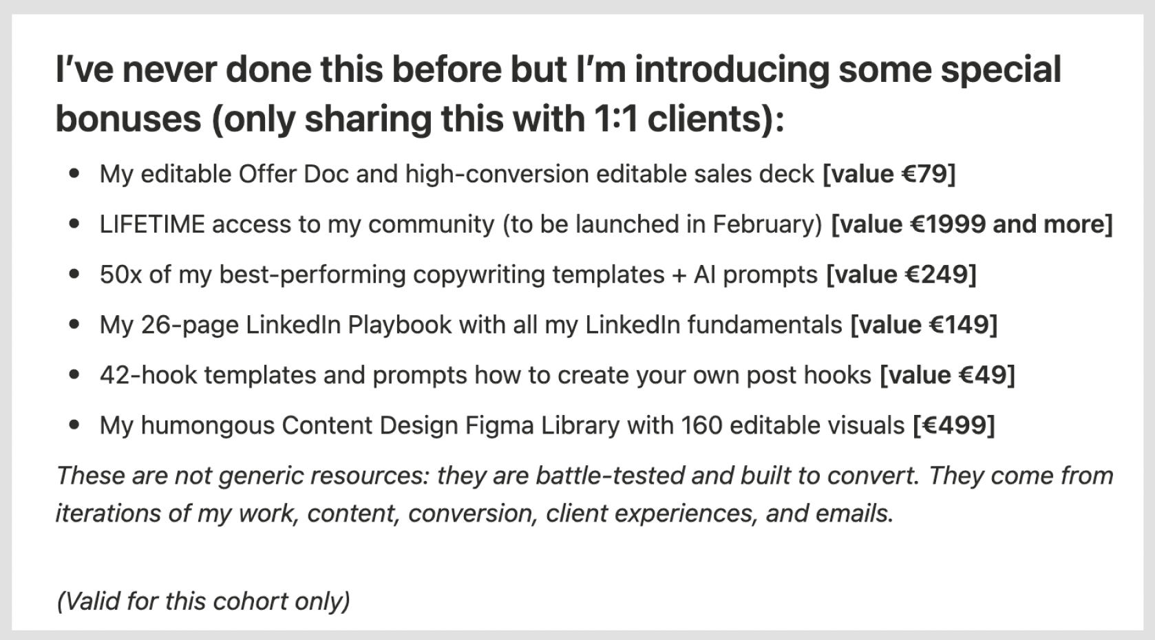 If you're like me, you're impulsive by nature. But when doubt creeps in? Then you lose your decisiveness. You see an opportunity – like a sales email or some kind of offer that looks like a no-brainer. And then you just freeze. You let the opportunity die. You wonder where that impulsiveness has gone. For me that was a $6k mastermind hosted by Greg Eisenberg in Florida. 50 like-minded people. One big Airbnb. 3 days. Been following the guy for years. But I just froze. I didn't act. Maybe it was the distance that made me doubt about enrolling. Maybe I just made up an excuse it wouldn't be worth it. But I honestly regret not deciding to do it. It would've been life-changing for me: To tap into his brain, get access to his frameworks, and connect with other entrepreneurs. Now, if you're also like me, you dislike crowds. And traveling is nice unless it's for work. You'd rather stay with your family, or the comfort of your office or home. It's why I'm doing my cohort online. I keep it small and private. So far, 9 people will join tomorrow. 9 people with the same pains, frustrations, and goals. 9 people who are determined to change what they don't like about their situation. Or people who simply want a better way to grow than dropping €3k/month on 1:1 coaching. The good news is that for €2k, you'll get access to all my 1:1 resources. And my 1:1 clients are friggin killing it. I literally got this update from my client today ↓ Bonus: you'll even get access to my community that I'm launching soon (€1k p/y). Lifetime access included for January cohort members (and more:) I'm going to wrap it up here. This will be my final January cohort email. We've got around 1.5 hrs (10 PM CET) left until enrollment closes. There won't be another Content Design Cohort in 2 months. If you want to get in, here's your shot. Everything you need to know is in here. I'd be stoked to have you in. Over and out, Nick |