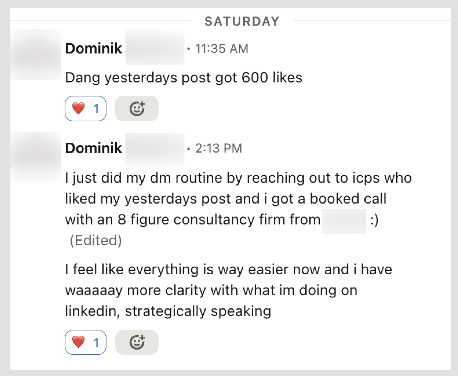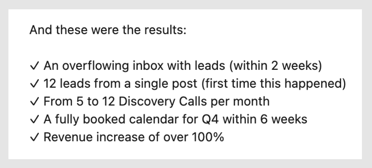 It's business, not a fashion show. Frank is a coach. He wasn't trying to build an audience – he was trying to get clients. One post brought 12 qualified conversations. After 6 weeks, he was fully booked out. Then he built a community that attracted 100+ paying members at launch. That's not influencer metrics. That's business metrics. Objection #5: "But I'm not a marketer or designer. How am I supposed to do this?"You're not a designer. Not a copywriter. The idea of designing content and writing positioning for your offer feels outside your wheelhouse. So you either post raw thoughts and hope they land, or you spend 2 hours overthinking one caption, or you don't post at all. Here's what's actually true: you don't need to become a designer or copywriter. You need a system that makes both simple enough to do yourself. You probably present to clients, right? You don't wing those presentations. You have structure. You know what you're saying. You might use visuals. Content is the same. Good design means: this visual guides attention to what matters. Good copy means: I explained what I do and who it's for, so there's no confusion. Dominik is an email marketer. Not a content creator by trade. But he applied a system anyway: clear positioning, consistent visuals, copy that explains why it matters. MRR went up 116%. Followers grew from 11k to 14.2k. He didn't become a marketer. He used a repeatable system. That's what you're learning. What CAN change for youLet's make this real. Week 1: You have clarity on your ICP. Your profile is rebuilt. Suddenly you know who you're talking to (and who you're not) in your content. Week 2-3: Your positioning is tight. The people who find you now either think "this is for me" or they don't. Less confusion. More "warm" interest. Week 4: You have a content system. You're not starting from zero anymore when you create. You know how to do warm outreach. After that: continuous account + business growth depending on effort and consistency. Some people see deals close immediately. Some people see momentum building over the following weeks. Some people invest and never use it. Some even didn't show up or post once. The system works for those who apply it. What happens next is on you. So where does that leave you?Right now, you're in one of two places: